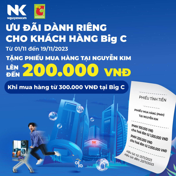 Điều bất ngờ gì sắp xảy ra, bạn biết không? Cơn lốc mua sắm tại Big C và Nguyễn Kim chính thức đổ bộ. Từ 01.11 - 19.11.2023, khách hàng mua sắm tại hệ thống siêu thị Big C toàn quốc với hóa đơn từ 300.000 trở lên được nhận ngay 1 phiếu mua hàng tại Trung tâm mua sắm Nguyễn Kim.